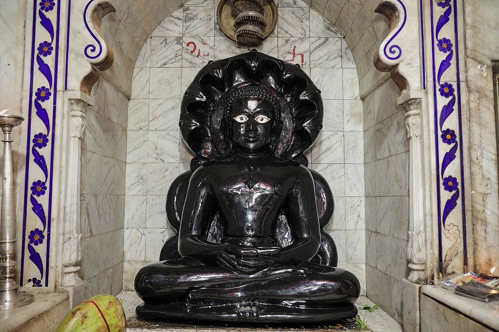 Nearly 107 cm high, black-colored idol of Bhagawan Parshvanath in the semi-Padmasana posture.
