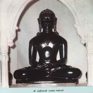 Nearly 76 cm. high, black-colored idol of Bhagawan Adishvar in the Padmansana posture.