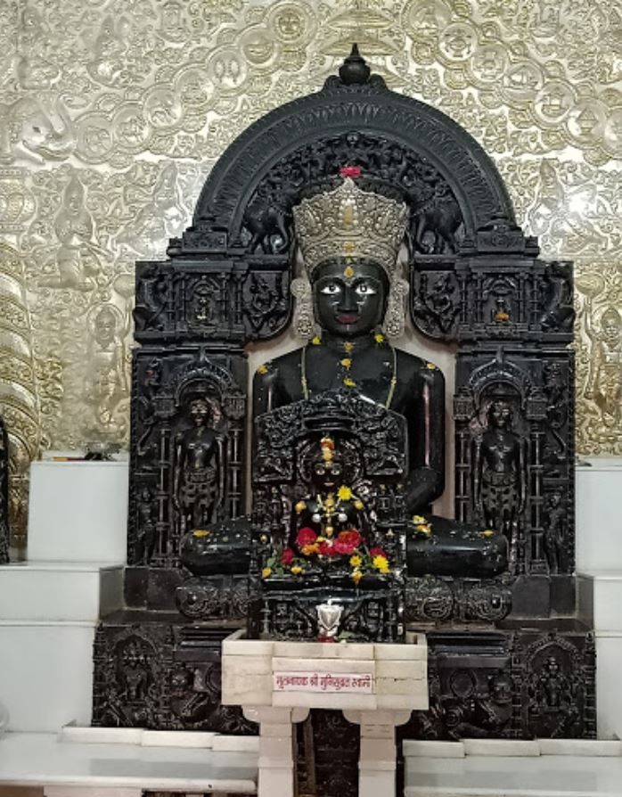 Nearly 45 cm high black-colored idol of Bhagawan Munisuvrat Swami in the Padmsana posture in the Svetambar temple (Vipulachal Hill).