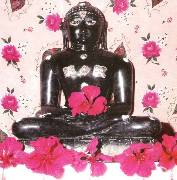 Nearly 35 cm. high, black-colored idol of Bhagawan Adishvar in the Padmasana posture.