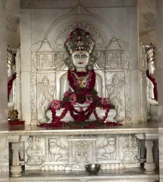 Four Idols of Bhagwan Adishwar, facing in four directions. They are of white colour and shine brightly.