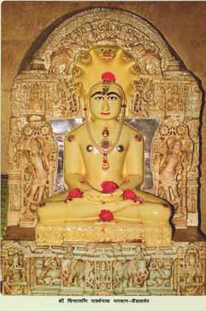 Jaislmer is the new capital established by Jesalji after the fall of Lodrava. The inscription states that the time of the fall of Lodrava, The idol of Bhagwan Chitamani Parshvanath, Mulyanak, was installed by Acharya Jinapatisurishvaraji in Jaislmer in the year 1263 of the Vikram era. The inscription also states that this idol was installed by Jinvardhansurisvarji in the year 1473 of the Vikram era. Possibly the idol was reinstalled after renovation of the temple. This temple was then named ‘ Lakhshaman Vihar’. This was a center of the Jain religion. Jaislmer is famous for its distinct art. For its rich collection of books, Jaislmer is also famous in the country and abroad. Books on various subjects are stored here. They are very rare. This is center of special attraction to research workers. There was an idol of Bhairav near the idol of Parshvanath. Thinking that is was not proper to seat the servant on the same level beside Swami, Suriji seated Bhairavji outside the temple. On the next day, the idol was at the same place. Believing Bhairvaji to be an obstinate god, Suriji performed a very loud incantation. The idol itself went and sat outside. The idol of Bhairavaji is very miraculous. Next to the tirth of Shetrunjaya, this tirth has such a large number of idols. There is an idol of the size of an oil - seed in a temple of the size of a grain of barley. Many rich merchants of this place gained by doing many religious activities.