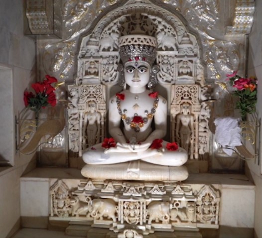White-colored idol of Bhagawan Adishvar in the Padmasana posture.
