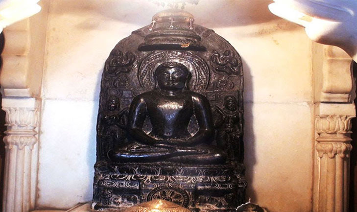 Nearly 38 cm high., black-colored idol of Bhagawan Mahavir Swami in the Padmasana Posture.