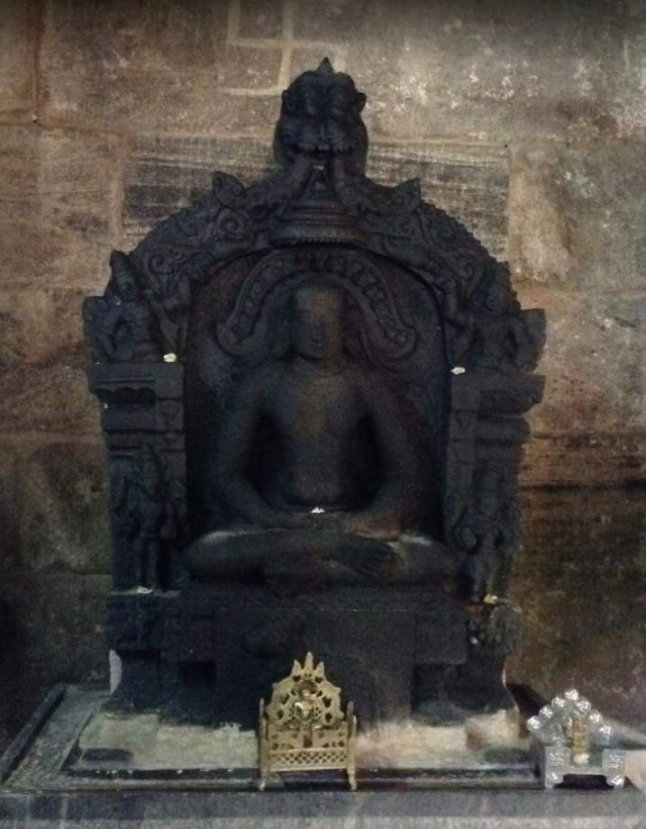 Nearly 30 cm high, black-colored idol of Bhagawan Chandraprabh in the semi-Padmasana posture.