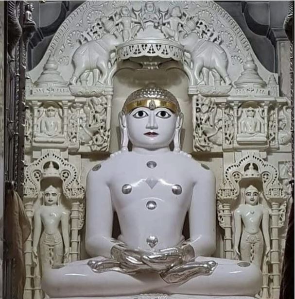 150 cm. high, white colored idol of Bhagawan Adishver in the Padmasana posture.