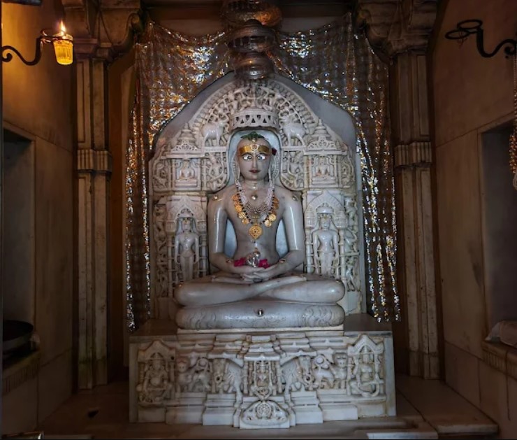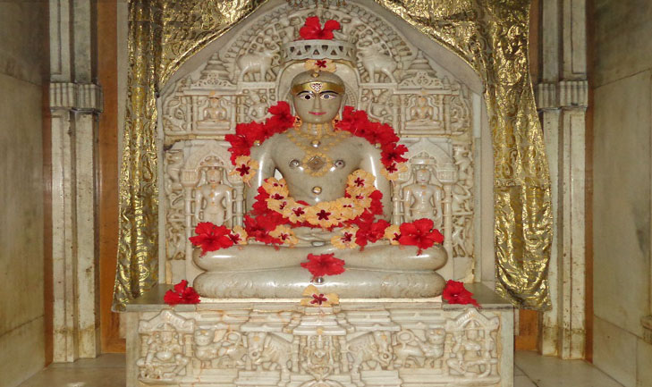 Nearly 90 cm high,white-colored idol of Bhagawan Mahavir in the Padmasana posture