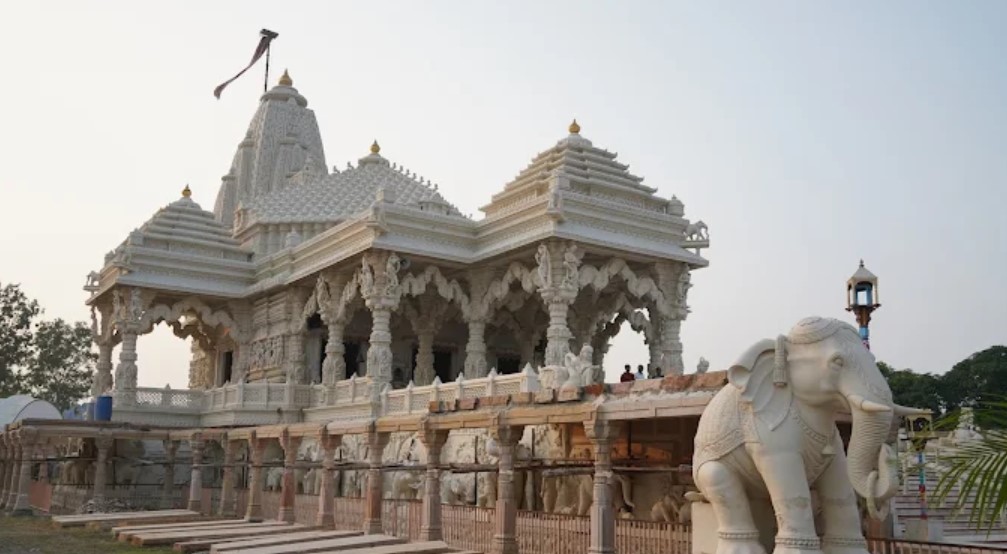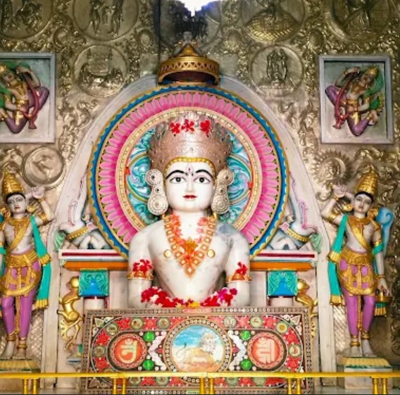 The history of this place is not available. On the thirteenth day of the bright half of the month of Magh. in the year 2049 of the Vikram era, the great festivity of installation of this splendid idol was celebrated under the auspices of Acharyas and 125 Sadhu - Sadhvis. On the bank of the Sinhan river in the midst of the pleasing sound of the rippling waves of water of the dam, near the gardens of various fruits, on the shore of the western sea, the beautiful, splendid and delightful temple stands. Its main gate is 35 ft. high. It reminds one of Rampol.