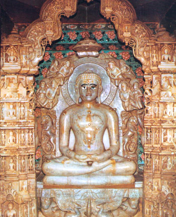 Nearly 210 cms high,white-colored parikarayukta idol of Bhagawan Mahavir Swami in the Padmasana posture.
